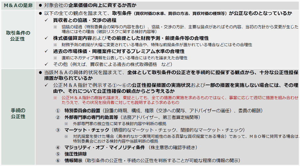 これまでは「少数株主に不利益ではない」ことに関する意見の取得が求められていたところ、今後は取引条件の公正性や手続の公正性について、企業価値の増加分が一般株主に公正に分配されているかという観点から、十分な説明が求められます。検討すべき観点は大きく分けて、①M&Aの是非(企業価値向上に資するか)、②取引条件の公正性(買収対価の水準、買収の方法、および買収対価の種類等の公正性)、③手続の公正性、の3点です(図表2)。
