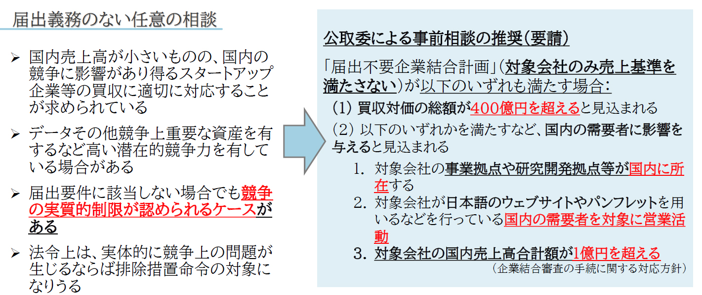 通常、当事会社が所定の国内売上高を有するといった法定の基準を満たさなければ事前届出は不要ですが、最近は、国内の競争に影響力があるスタートアップ企業等の買収などに対し、当局が強い関心を示しています。公取委は、買収対価が400億円を超え、かつ、国内拠点やある程度の売上があるなど国内の需要者に影響を与えると見込まれる場合には、事前の任意相談を推奨しています(図表3)。