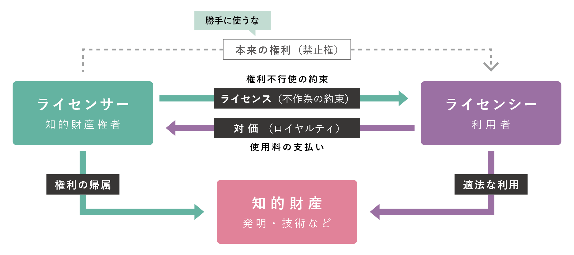 ライセンスをめぐる法律関係をみると、知的財産権は、上述のとおり、他人が勝手に知的財産を利用することを禁止する権利であるのに対し、ライセンスは、ライセンシーが、ライセンサーの知的財産を利用するにあたって権利を行使されないようにする権利、つまり、知的財産権という禁止権の行使を禁止する権利であって、「禁止権の禁止権」に位置づけられる。これを法的にみれば、ライセンスとは、知的財産権の行使についての不作為請求権であり、より平易に表現すれば、知的財産を「使わせないとはいわせない」権利ということができる。